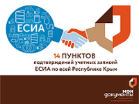 Напоминаем вам, что в рамках Распоряжения Совета министров Республики Крым (от 11 апреля 2016 г. №343-Р, плана мероприятий п.1 «Организация пунктов подтверждения учетных записей Единой системы идентификации и аутентификации на базе многофункциональных центров предоставления государственных и муниципальных услуг»), ГБУ РК «МФЦ» было организовано 14 пунктов подтверждений учетных записей ЕСИА по всей Республике (29 действующих окон по всей территории Крыма) ссылка