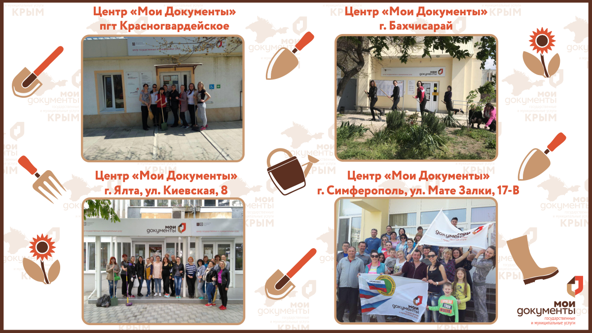 14 апреля сотрудники ГБУ РК «МФЦ» сменили свою официальную форму и кипы бумаг на грабли и перчатки. Во всех центрах и офисах «Мои Документы» по Республике Крым состоялся субботник.