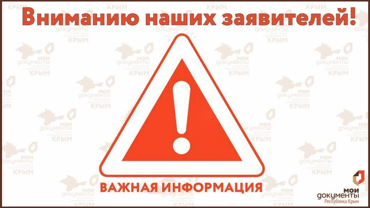 Уважаемые крымчане, сообщаем вам, что с 14.09.2020 прием граждан во всех центрах "Мои Документы" Крыма будет осуществляться только по предварительной записи.