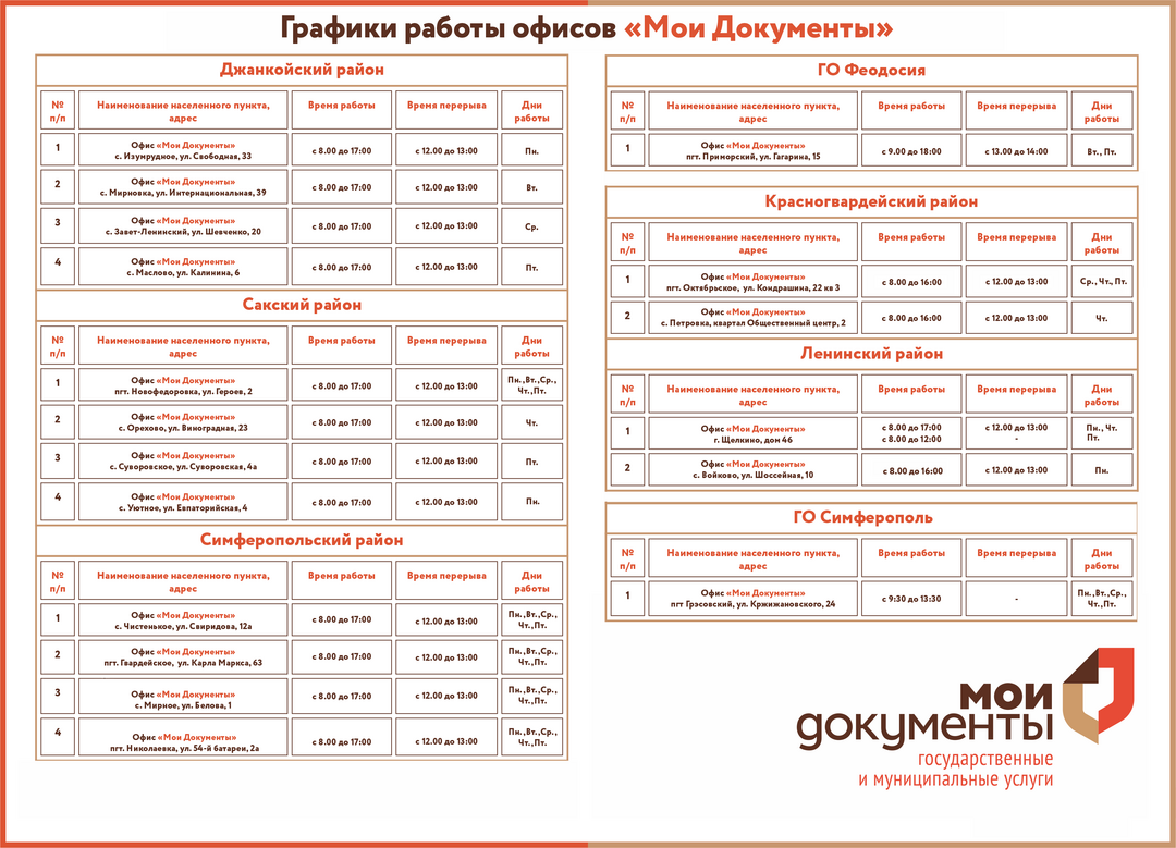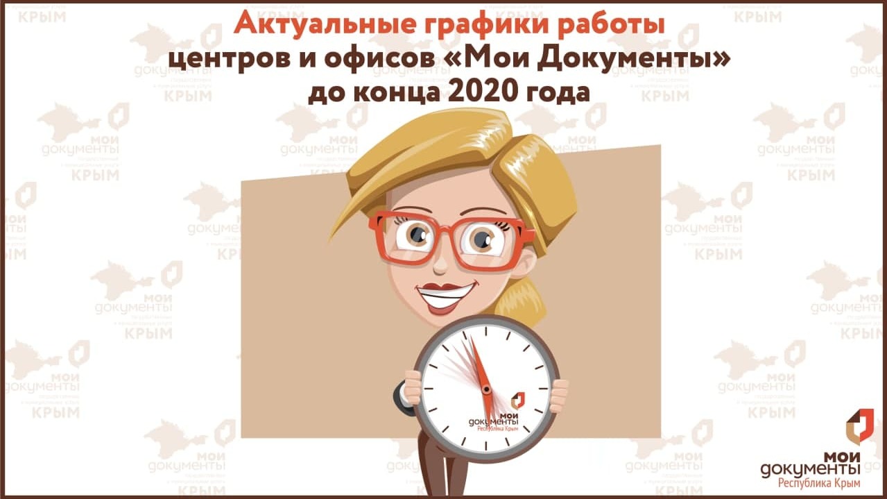 Уважаемые жители и гости Республики Крым, ГБУ РК "МФЦ" размещает актуальные графики работы центров и офисов "Мои Документы", действующие с 14.12.2020 и до конца 2020 года (прилагаются).
