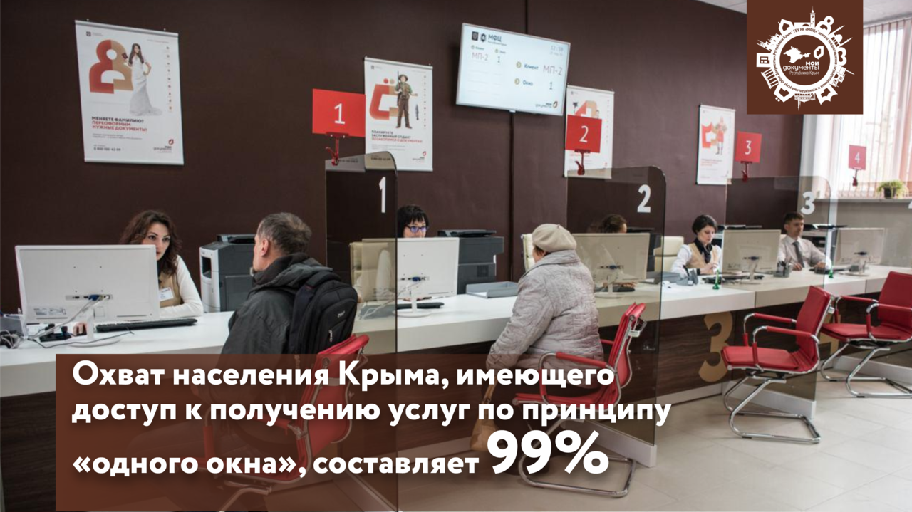 Так, исходя из обновленных данных Проектного офиса Минэкономразвития РФ, доля граждан, имеющих доступ к получению государственных и муниципальных услуг по принципу "одного окна" в Республике Крым, составляет 99 %.