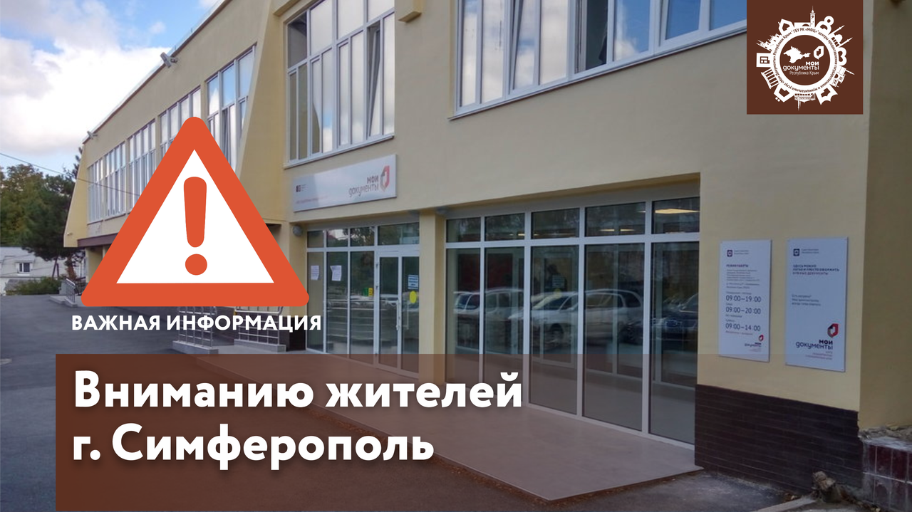 Уважаемые заявители! Сообщаем вам, что 22.02.2021 не будет осуществлять прием граждан центр "Мои Документы" г. Симферополь (ул. Мате Залки, 17в). Прием не осуществляется в связи с проведением профилактических работ в центре обработки данных Росреестра с 21.02.2021 по 23.02.2021 согласно письму Государственного комитета по государственной регистрации и кадастру РК.