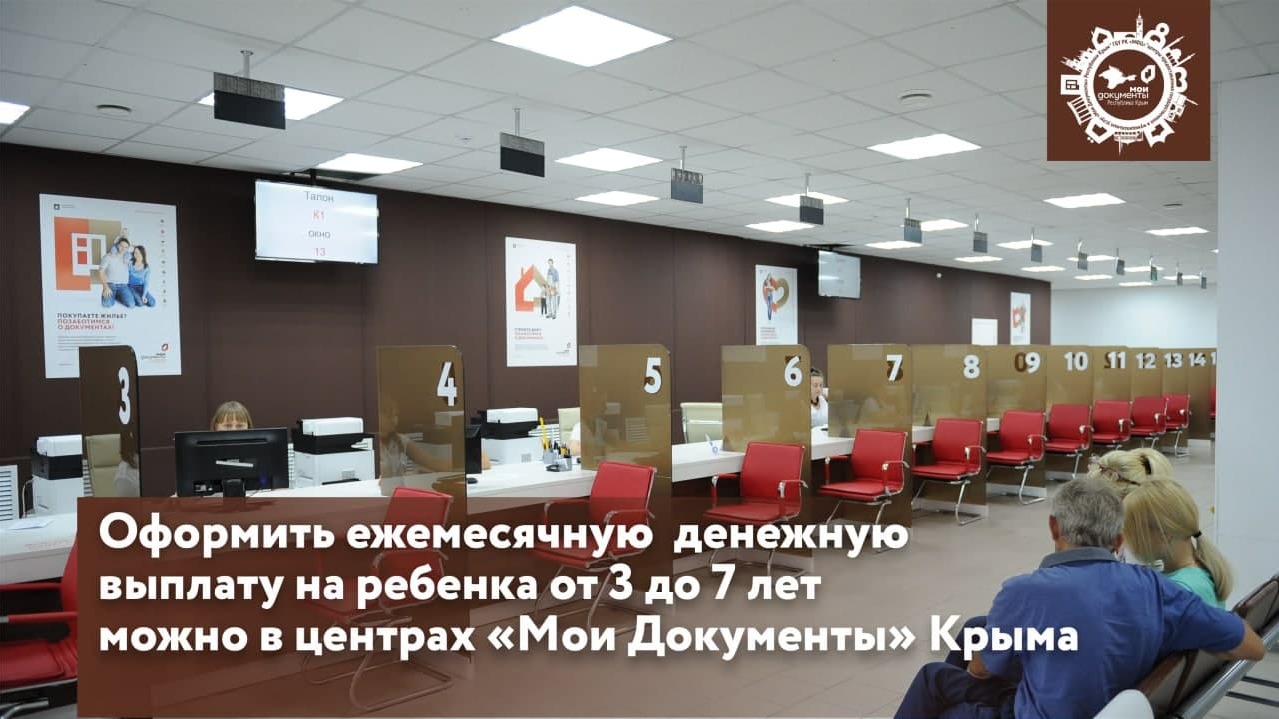 ГБУ РК «МФЦ» сообщает, что с 12.04.2021 услуга «Назначение и выплата ежемесячной денежной выплаты на ребенка в возрасте от 3 до 7 лет включительно» доступна во всех центрах «Мои Документы» Крыма.