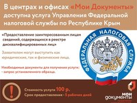 Напоминаем вам, что в многофункциональных центрах и офисах предоставления государственных и муниципальных услуг «Мои Документы», доступна услуга Управления Федеральной налоговой службы по Республике Крым «Предоставление заинтересованным лицам сведений, содержащихся в реестре дисквалифицированных лиц».